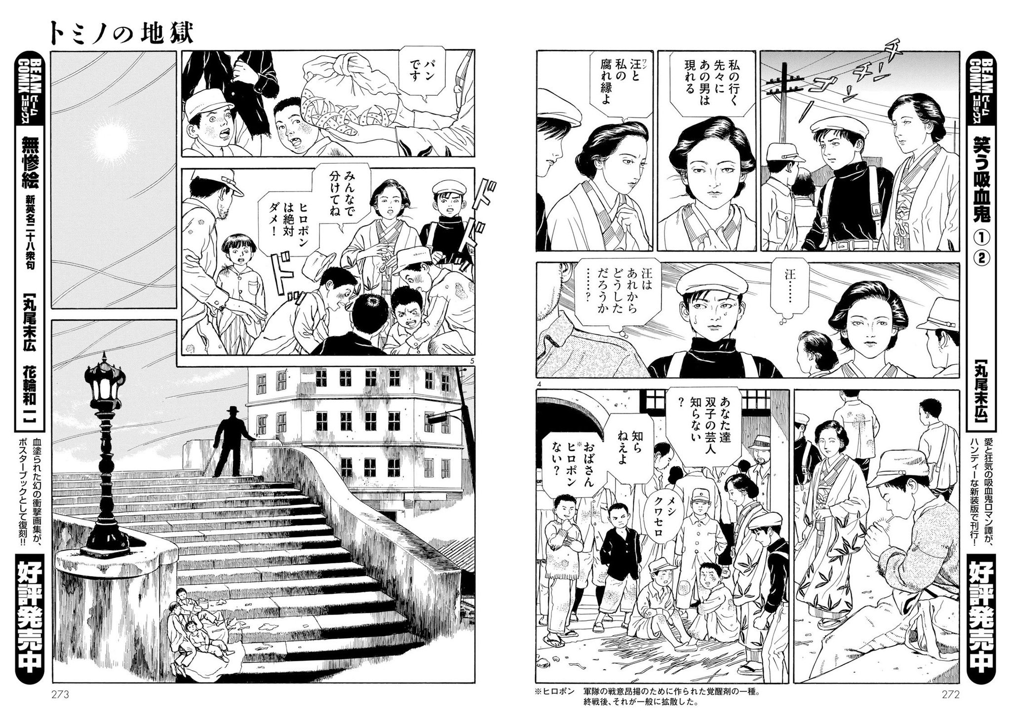 可愛いトミノの眼にや涙。 啼けよ、鶯、林の雨に 妹恋しと声かぎり。 啼けば反響(こだま)が地獄にひびき、 狐牡丹の花がさく。 地獄七山七谿めぐる、 可愛いトミノのひとり旅。 地獄ござらばもて来てたもれ、 針の御山(おやま)の留針(とめばり)を。トミノの地獄 西条八十 姉は血を吐く、妹は火吐く、可愛いトミノは宝玉(たま)を吐く。 ひとり地獄に落ちゆくトミノ、地獄くらやみ花も無き。 鞭で叩くはトミノの姉か、鞭の朱総(しゅぶさ)が気にかかる。 叩けや叩けやれ叩かずとても、無間地獄はAmazonで丸尾 末広のトミノの地獄 4 (ビームコミックス)。アマゾンならポイント還元本が多数。丸尾 末広作品ほか、お急ぎ便対象商品は当日お届けも可能。またトミノの地獄 4 (ビームコミックス)もアマゾン配送商品なら通常配送無料。